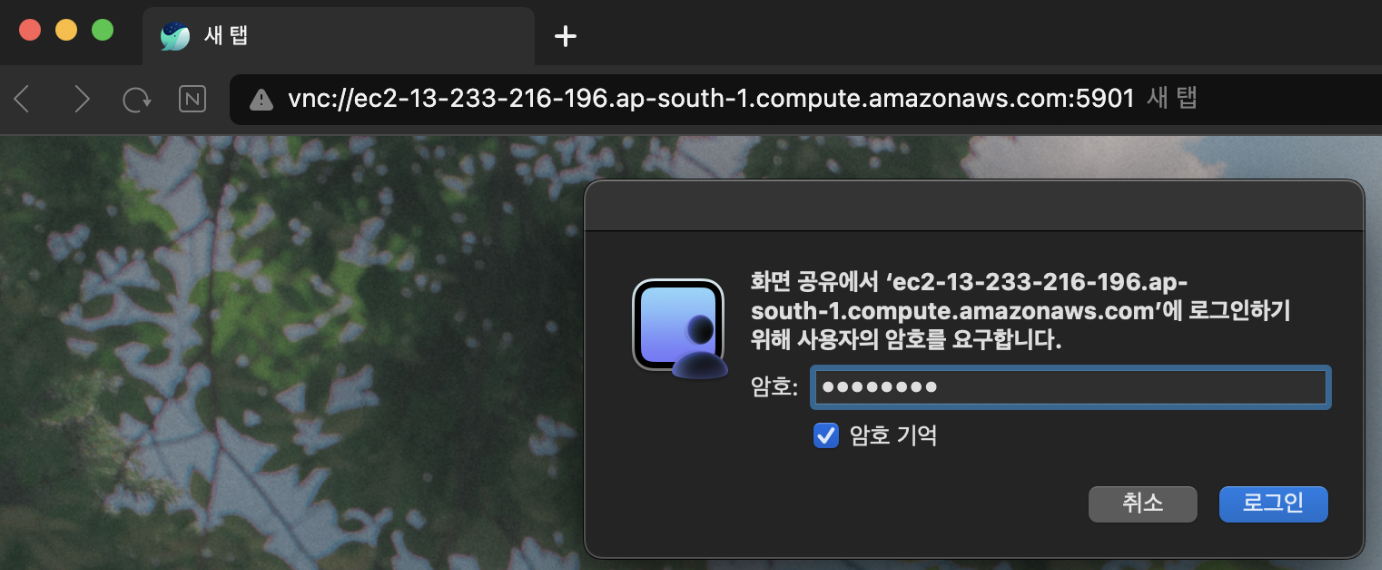 Security Group에 VNC port가 허용된 것을 확인하고 사용하는 브라우저에서 5901 포트로 접근을 하면 VNC Server 설정한 패스워드를 요청한다.