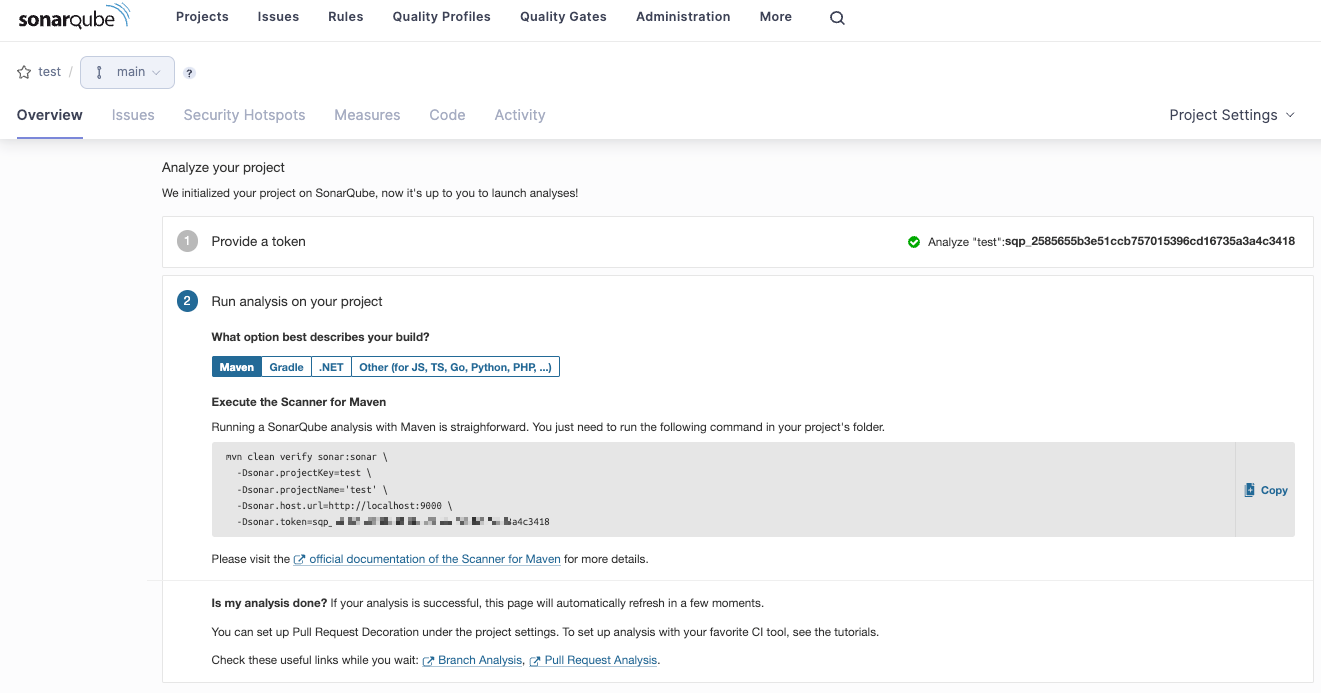 코드 분석하고자 하는 repository의 Project를 생성하면 아래와 같이 실행 가능한 Token 발행