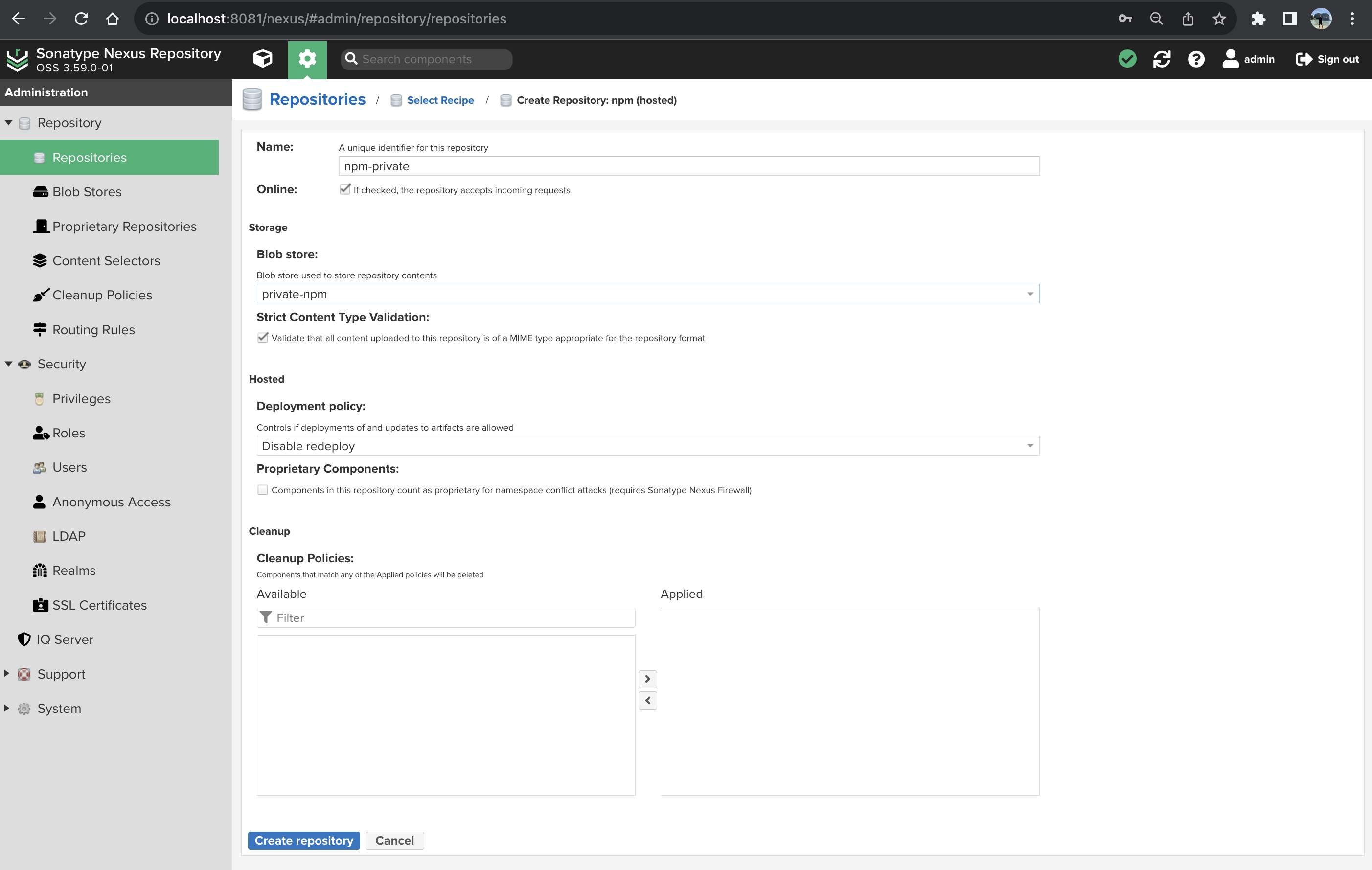 npm(hosted) 선택 & npm-private 생성