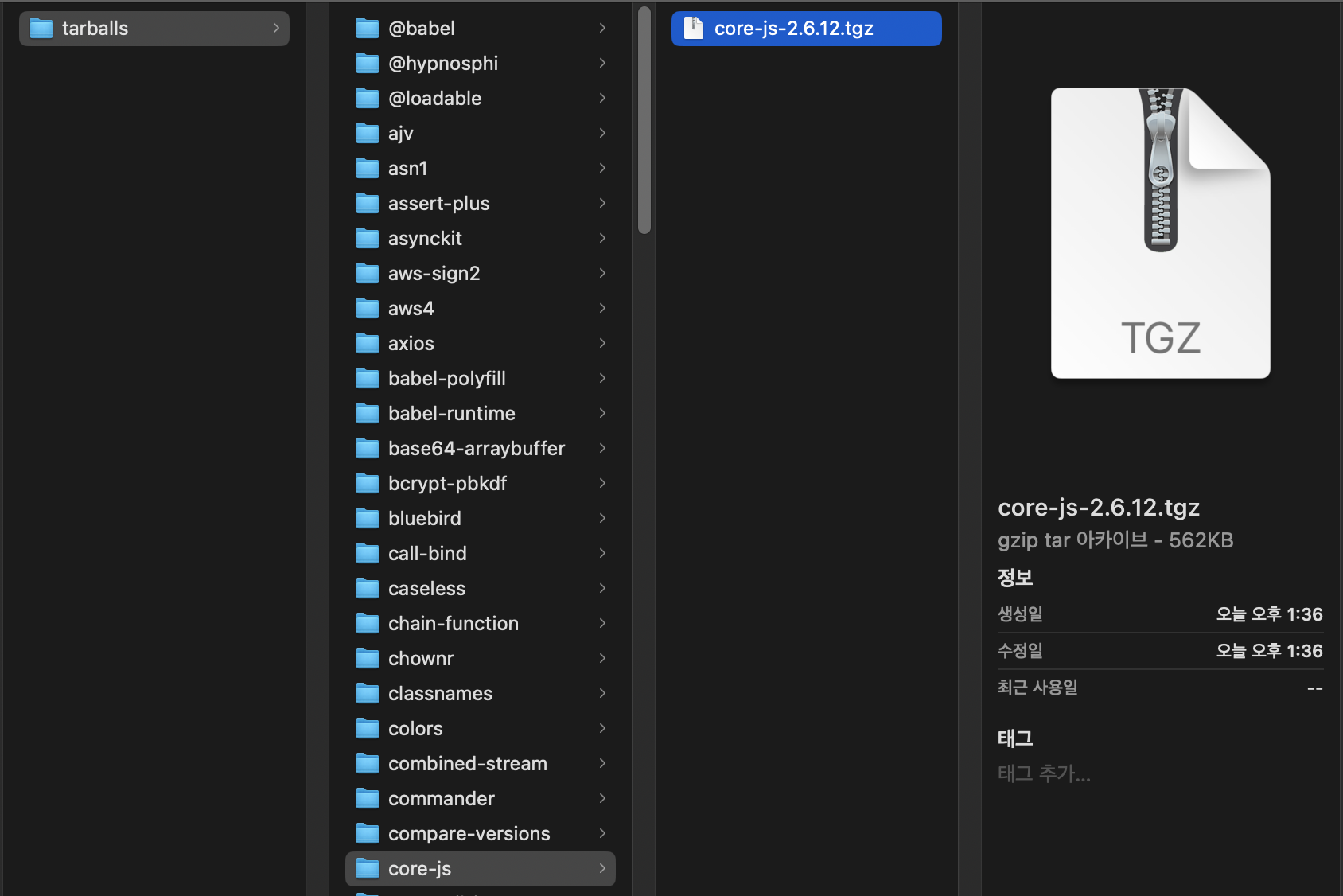 ./tarballs 폴더 이하 package.json에 정의된 모든 package가 tgz 형태로 다운로드